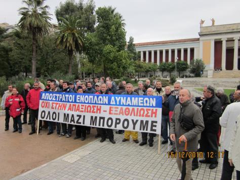 "Μήνυμα ενότητας και σύμπνοιας έδωσαν οι συνάδελφοι, από όλους τους Κλάδους των ΕΔ, που ανταποκρίθηκαν στο κάλεσμα της Συντονιστικής Επιτροπής Αποστράτων Ενόπλων Δυνάμεων για τη συμμετοχή μας στην πορεία διαμαρτυρίας, που διοργανώσαν η ΓΣΕΕ και ΑΔΕΔΥ σήμερα 15 Δεκεμβρίου 2010.