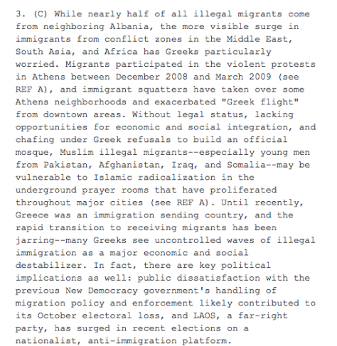 Σε τηλεγράφημα της αμερικανικής πρεσβείας από την Αθήνα, επισημαίνονται αυτοί οι φόβοι καθώς και το γεγονός ότι ύποπτοι για συμμετοχή σε τρομοκρατικές οργανώσεις φθανουν στις ΗΠΑ,περνώντας από την Ελλάδα,όπου πιθανόν να δραστηριοποιούνται «μηχανισμοί διευκόλυνσης» τους για να φθάσουν στις ΗΠΑ.