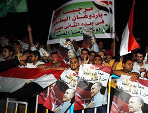 Αυτά ήταν κάποια από τα συνθήματα που φώναζαν οι περίπου 1500 Αιγύπτιοι που έσπευσαν στο αεροδρόμιο του Καϊρου για να υποδεχθούν τον Ρετζέπ Ταγίπ Ερντογάν που ξεκινά περιοδείες στις χώρες της «Αραβικής Άνοιξης» με πρώτο σταθμό την Αίγυπτο.