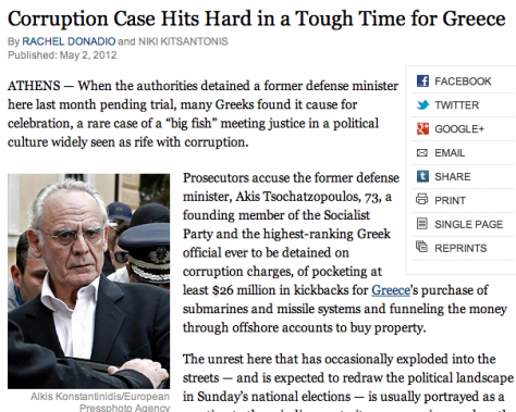 Στο ρεπορτάζ επισημαίνονται τα τεράστια οικονομικά προβλήματα των Ελλήνων αλλά τονίζεται επίσης ότι “για πολλούς Έλληνες, η διαφθορά είναι εξίσου σημαντικό ζήτημα όπως οι περικοπές μισθών και οι αυξήσεις φόρων”.