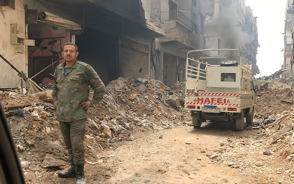 Επειτα από δύο μπλόκα, αντικρίσαμε την κόλαση. Μια oλόκληρη συνοικία γκρεμισμένη σε απίστευτο σημείο. Δεξιά και αριστερά, ήταν κρεμασμένα μεγάλα πανιά για να μην έχουν οπτική επαφή οι τζιχαντιστές-ελεύθεροι σκοπευτές. Κάθε λίγο ακουγόταν μία έκρηξη.