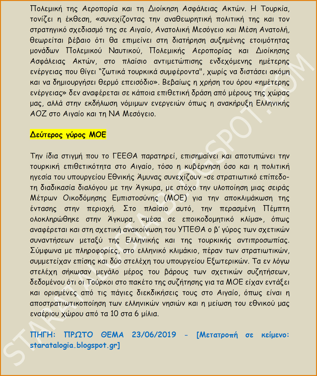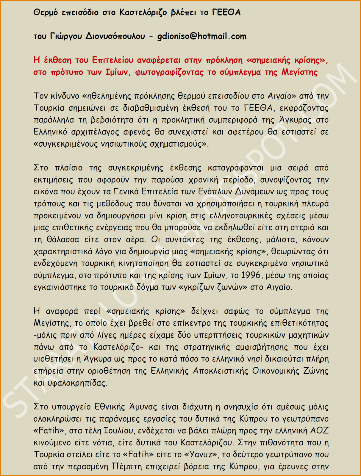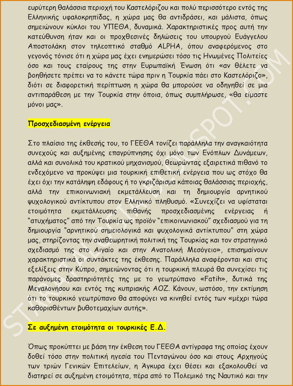 Η έκθεση του ΓΕΕΘΑ επίσης τονίζει την αναγκαιότητα συνεχούς επαγρύπνησης όχι μόνο των ΕΔ, αλλά και του κρατικού μηχανισμού, θεωρώντας εξαιρετικά πιθανό το ενδεχόμενο να ξεκινήσει μια τουρκική επιθετική ενέργεια, που ως στόχο θα έχει όχι την κατάληψη εδάφους, ή το γκριζάρισμα κάποιας θαλάσσιας περιοχής, αλλά την επικοινωνιακή εκμετάλλευση και τη δημιουργία αρνητικού ψυχολογικού αντίκτυπου στον Ελληνικό πληθυσμό.